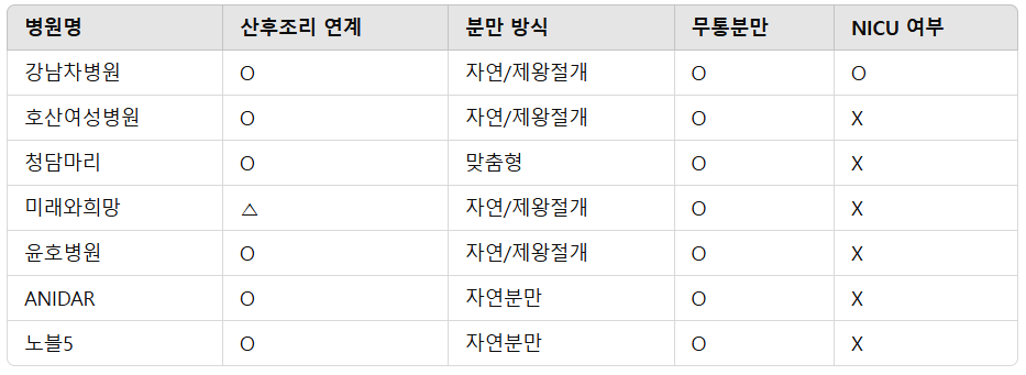 병원명산후조리 연계분만 방식무통분만NICU 여부
